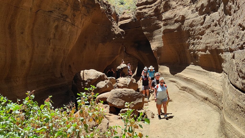 Just when you think the day can’t get more surprising, we enter Barranco de Las Vacas. One of Gran Canaria’s narrowest and most captivating ravines. Sculpted over centuries by the forces of water and wind, its smooth, terracotta-colored walls create a breathtaking geological formation and a photographer’s paradise. This enchanting walk offers a journey through history and nature, where the marks of erosion paint a truly mesmerizing backdrop.