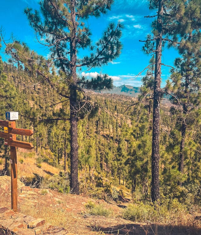 The route descended from the Pinar de Tamadaba through centuries-old trees and volcanic formations, offering panoramic views of the Tejeda massif, Roque Bentayga, Roque Nublo, and the Teide, before finishing in the traditional village of Artenara, surrounded by terraces and caves.